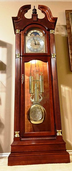 Model 610-814. Howard Miller Perfect Condition.. Description Mahogany finish on select hardwoods. Bonnet pediment features a dramatic carved shell framed by stepped swan neck pediment moldings. Base includes a decorative cutout. Polished brass-finished dial offers ornate corner spandrels, center disk, silver chapter ring with black Arabic numerals, and a stationary blue moon phase. Polished brass-finished pendulum and weight shells. Elegant columns frame the door which features crystal-cut V-grooved glass. Removable glass topside panels offer easy access to the movement. Locking door for added security. Adjustable floor levelers under all four corners level the clock on uneven and carpeted surfaces. A high-precision, German-made, chain-driven, Westminster chime plays 1/4, 1/2, and 3/4 chimes accordingly with full chime and strike on the hour. Chime silence option. Dimensions: Height 88.5". Width 27 1/2", Depth 16 1/2". Overall Weight 110 Lbs aprox. Willing to Consider Reasonable Offers. Local Pickup Only