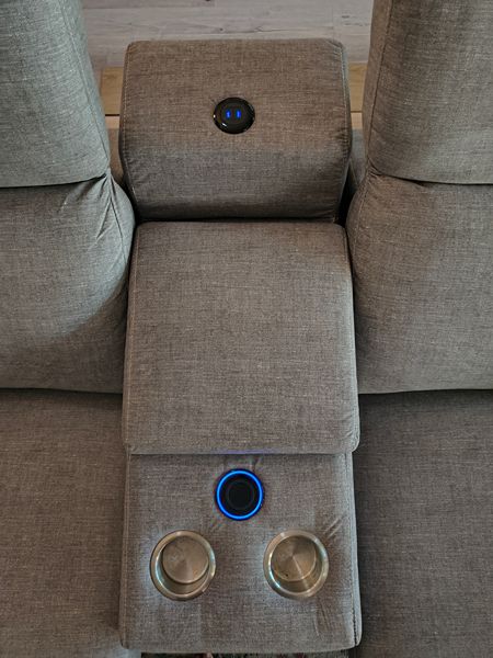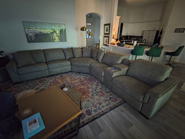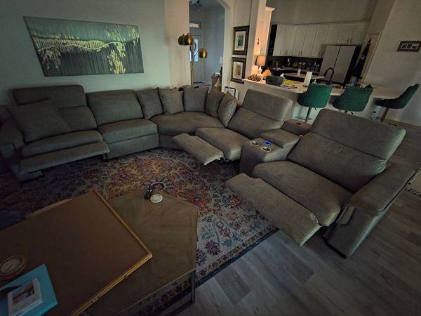 Awesome opportunity to own a like-new couch that is only a few months young! We absolutely love it but after having it delivered and seeing it in our home we realized it just doesn't go with all of our other green items in the house (for example, notice the unmatching green barstools in the background of the photos lol!) we were just so excited to finally find a sectional that had it all. After trying to ignore the obvious mismatch, we have finally decided it's time to sell it despite how perfect it is in every other way than the beautiful sage green color. It has 6 pieces to it that can be connected any way you like, including putting the media piece wherever you like. The media piece has 2 cup holders, a wireless charging spot, multiple USB ports including USB-A and USB 3.0 plus 125v and a deep storage bin for blankets, remotes, etc. The head rests and foot rests have separate controls for more customability for maximum comfort and a reset button to put it all back into place easy peasy! The fabric is sooo soft and we haven't seen any pilling. What did I tell you, the perfect sectional!! We looked long and hard for this and it's no longer sold in stores. We paid well over $2,000.
