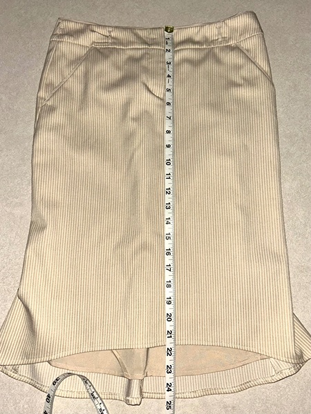 "Joey" pattern pinstriped skirt in soft camel colors. Skirt is lined, size 0, with short front zipper, double hook closure, belt loops, front and back pockets, and high-low hem. Material is polyester/wool/rayon/spandex with acetate lining. Dry clean only. Very good condition from smoke free home. $5