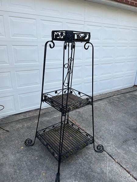 Three tiered wrought iron bakers rack with decorative scrollwork.