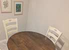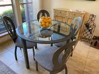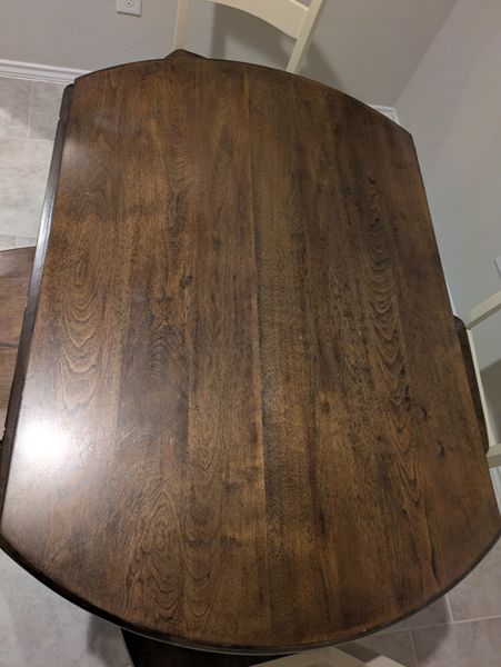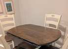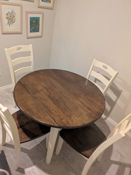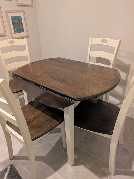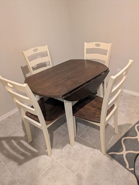 Two tone dining set with four chairs. This set was originally from Ashley furniture Woodanville model. I had this for about six years but very gently used. There are some scratches on the top of the table, but still in very good condition. The table has two leaves, and made with wood and engineered wood.