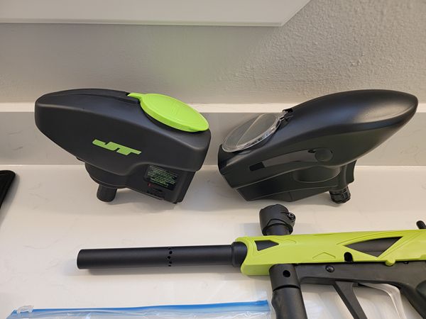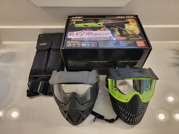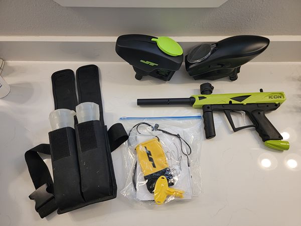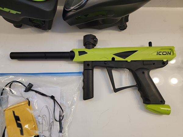 JT E-Icon paintball gun with 2 magazines, 2, masks, ammo canisters, cleaning tools and manual. In very good condition, only used a handful of times.