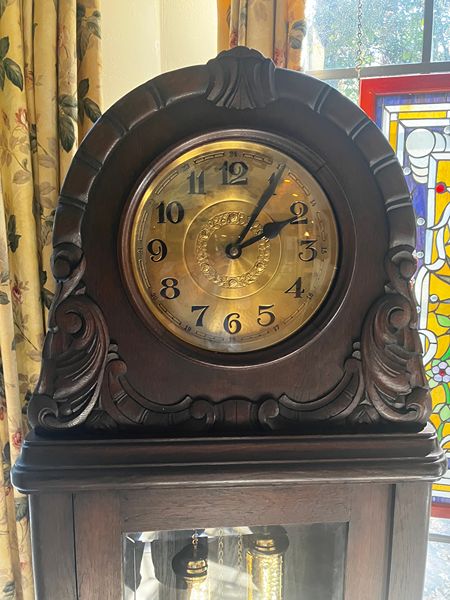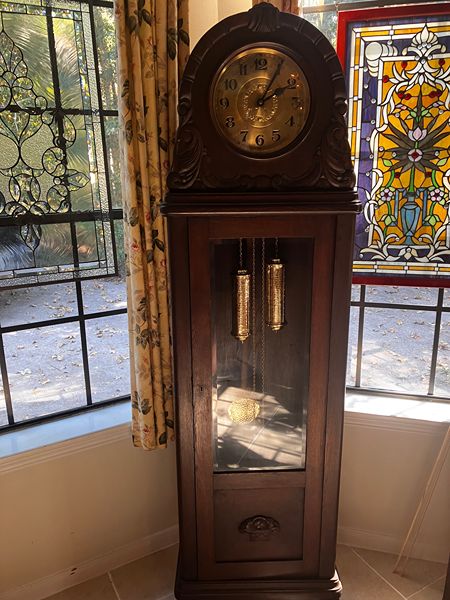 Antique Gustav Becker Grandfather clock that dates to late 1920s. Case is Oak and in excellent condition. Beveled glass door and convex dial glass. In running condition and keeps excellent time. Strikes the hour and half hour on a gong. 76"T 22"W and 7"D