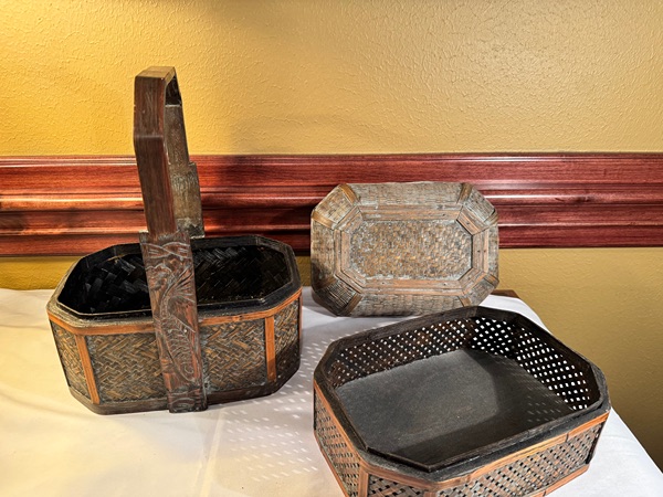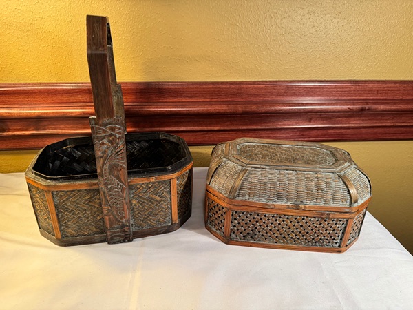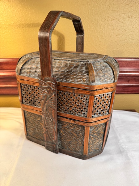 Unique and beautiful hand made Asian basket with fish carving on basket.