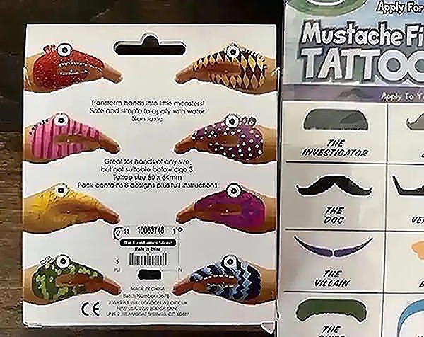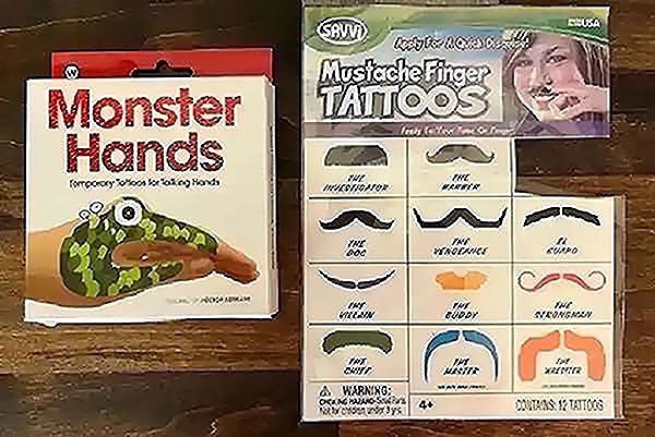 Monster tattoos (box of 8, now has 6) Mustache tattoos (contains 12, just missing 1)…$12 total, firm