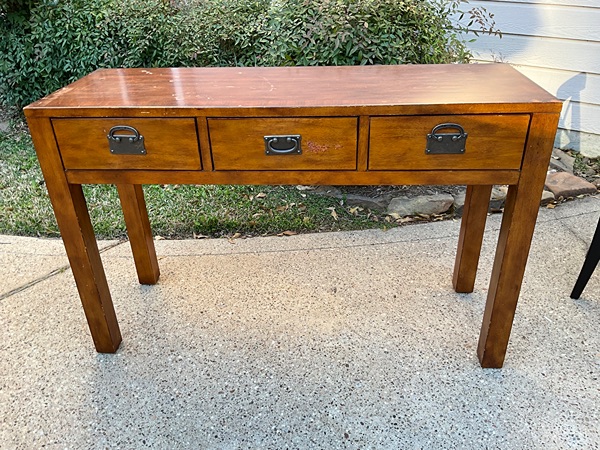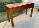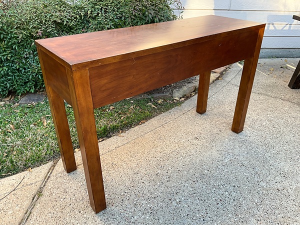 All wood console, 2 drawers. 33" tall, 18" deep, 52" long. Looks good with drawers facing out or the plain wood side facing out.