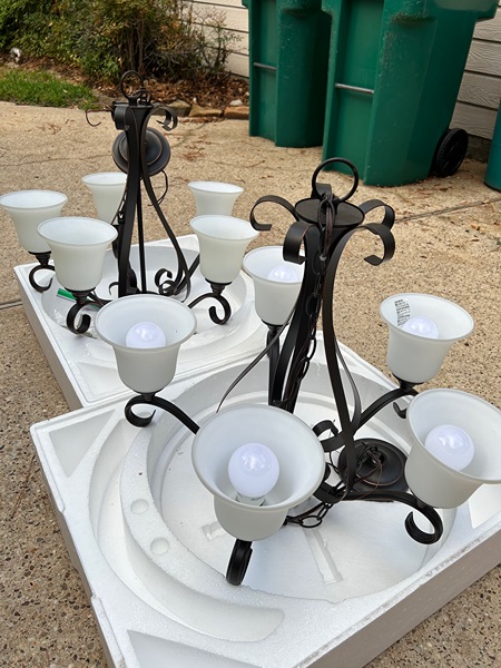 $25 each. Matching chandeliers, 5 lights, 24" wide