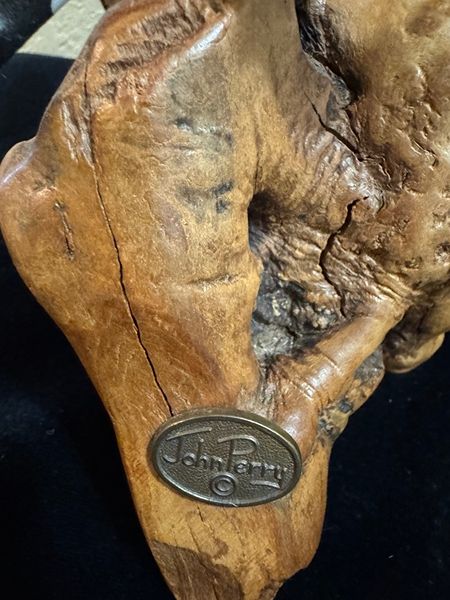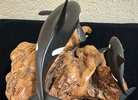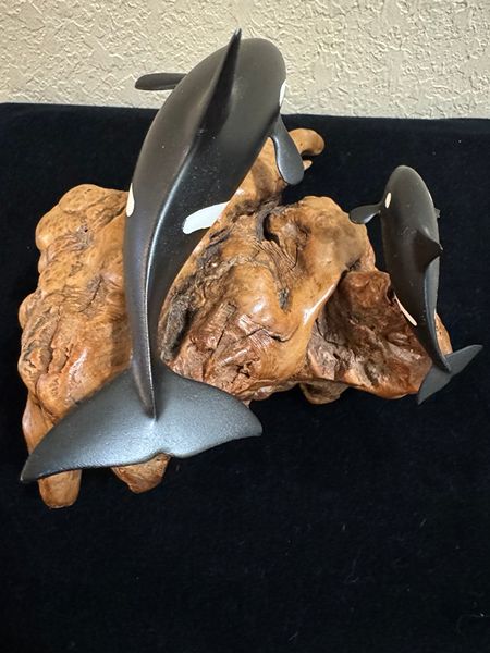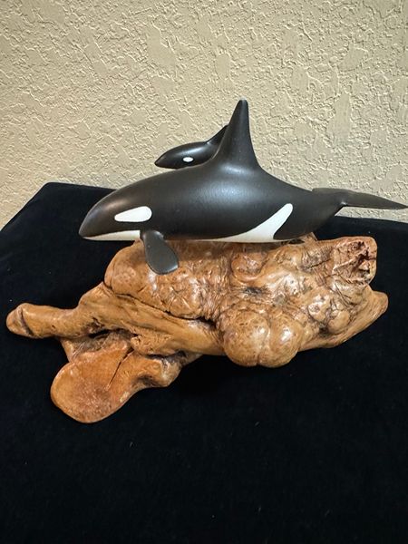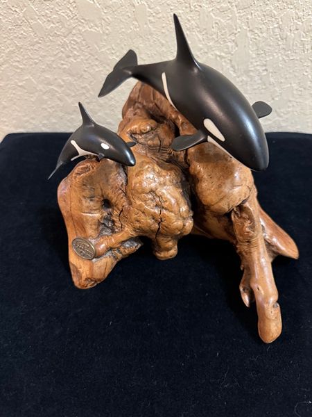 John Perry Decorative orca whale figures mounted on natural burlwood base *** Approximate size: Mother 6" ** Calf 3" ** Base 7" x 10" ** Height 7" *** Like new condition