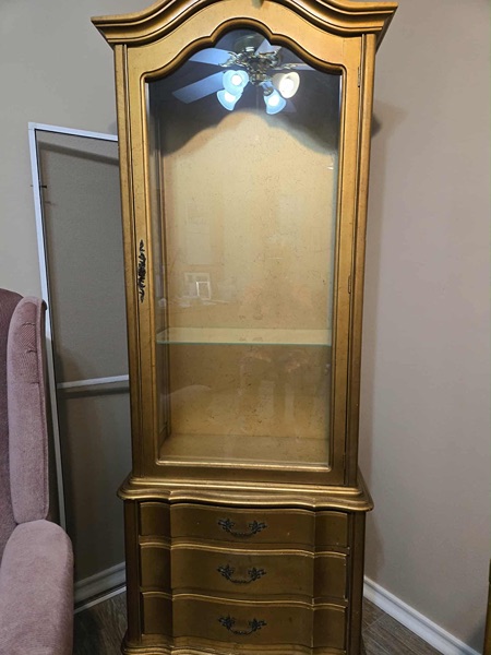 Vintage wood curio cabinet with drawers. A couple of glass shelves are missing. In excellent condition.
