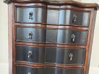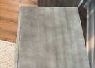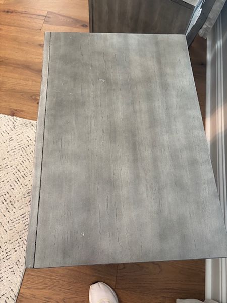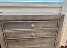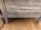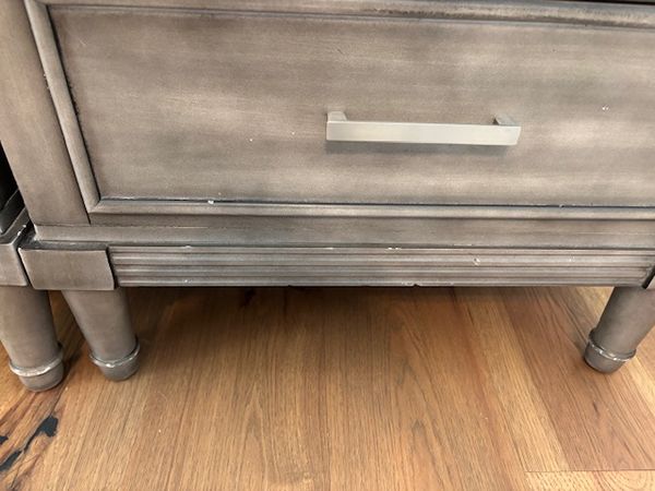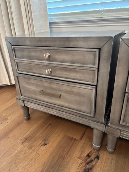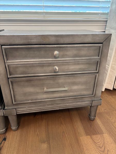Two gray nightstands with 3 drawers. There is a hidden drawer that is narrower once you open the top drawer. Bottom drawer is deeper than other drawers. We cut small holes on the backsides of each to send an extension cord through for our phones. These both have pretty nice tops, but there are nicks and scratches on the sides. of both.
