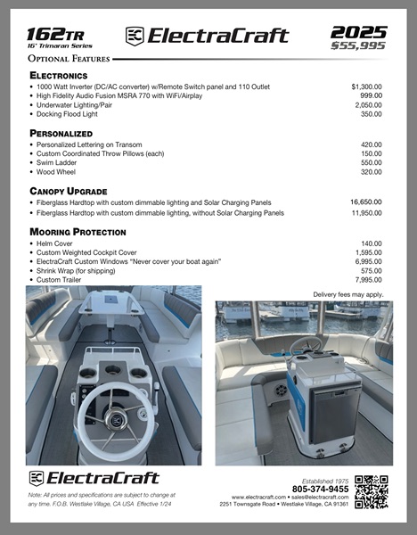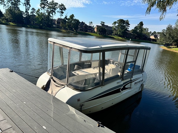 The ElectraCraft 162TR is designed for those who love to be at the center of thte action. Seating 8-10 people, this boat offers an intimite and social atmosphere where the drivers sits right in the middle of it. Standard features include a Bluetooth stereo, durable vinyl flooring and premium Sunbre4lla cushions for comfort and style. It comes equipped with both forward and aft bimin top and upgraded sleek fiberglass hardtop featuring dimmable recessed lighting for a more refined boating experience. Perfect for entertaining, relaxing and making the most of the time on the water. Purchased 2020. Top speed is 6 MPH - all solar powered. To purchase new retails $84,000 and a year wait time. Electracraft.com