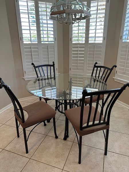 Moving..48" glass top kitchen table with 4 metal chairs.