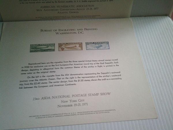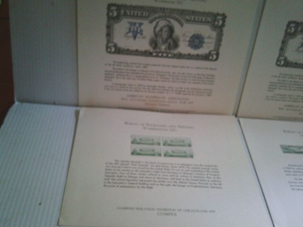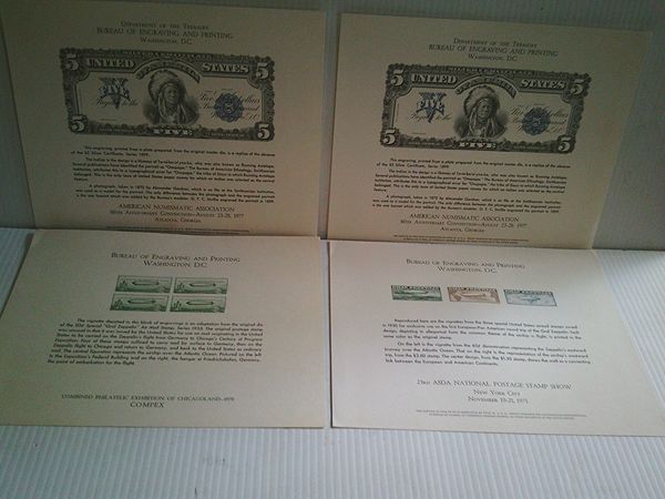 2 Bureau of Engraving And Printing souvenir card $5--1977 silver certificate series 1899 -2 Bureau of engraving and printing B-14 & B6 Graf Zeppelin1970 souvenir cards