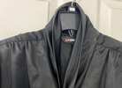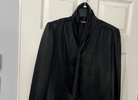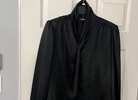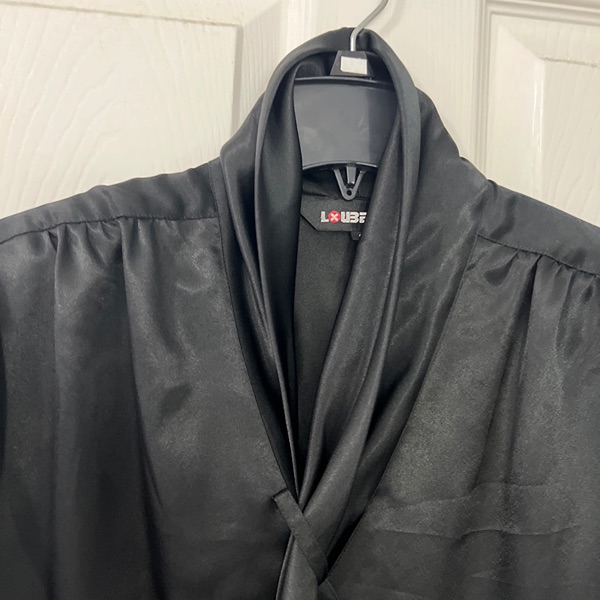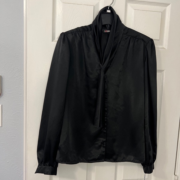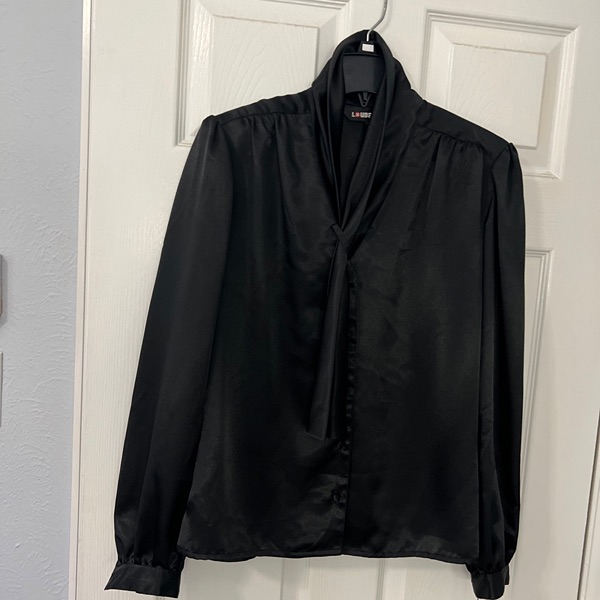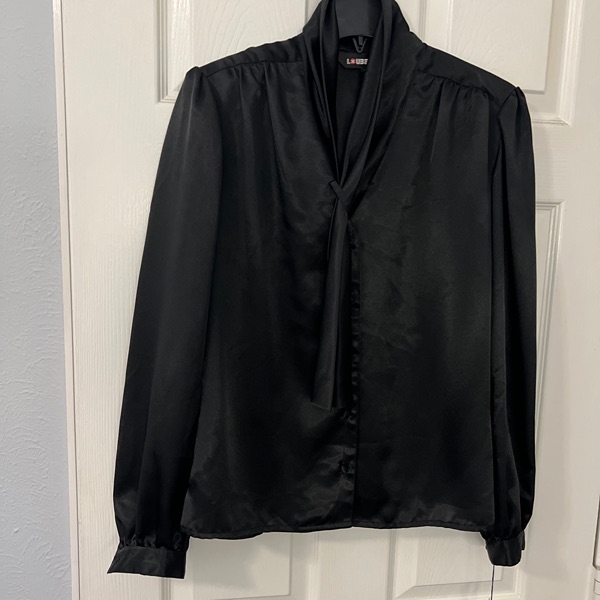 Vintage made in Taiwan Loubella Dressy black polyester blouse. Pleated fold Collar with cross over long tie which hides buttons. Collar can be worn all the way up or turned over . Buttons are covered. Long sleeve, pleated at the Cuff. Bottom of blouse is below waist with tuck in availability, cut straight across so could hang as well. Very light shoulder pad in the pleated shoulders. Pleats in a V on the back. Blouse can be used for career dressing, holidays, dressy suit, dressy skirt. Extra button sewn into the inside bottom. 24 inches from the tag at the back of the neck to the bottom of the blouse. This is brand new with its tags attached.