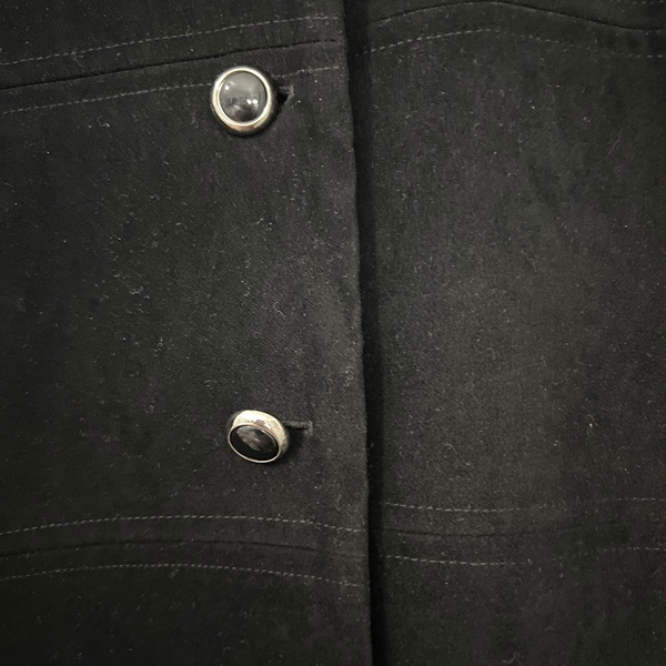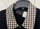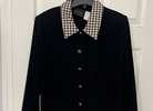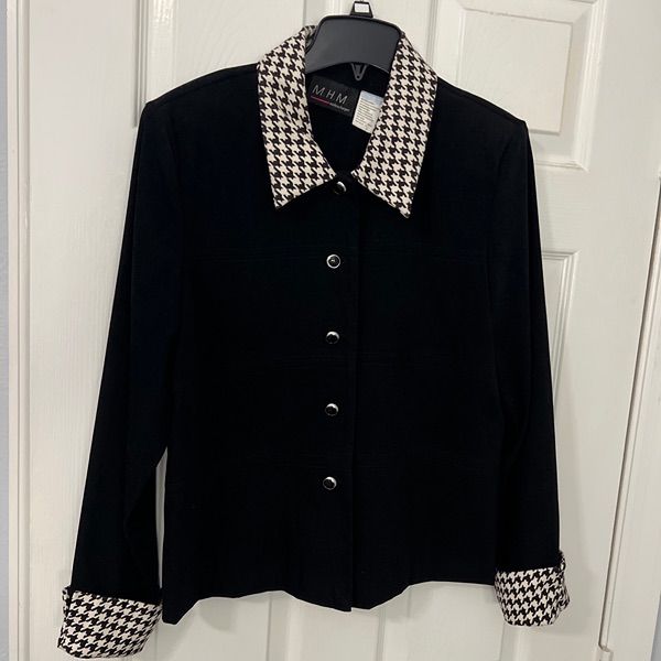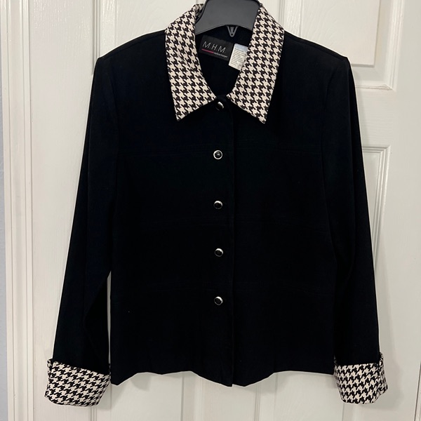 Melissa Harper vintage MHM Crush Velvet Black/ with a zigzag plaid white/black sleeve and collar. Long Sleeve Blazer Jacket Sz 14. Very light shoulder pads. Decorative silver and black 5 buttons. Jacket is just below waist length approximately 23”. Cuffs are turned up. Collar is 3” wide and pointy at ends. Very good condition!