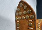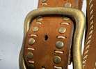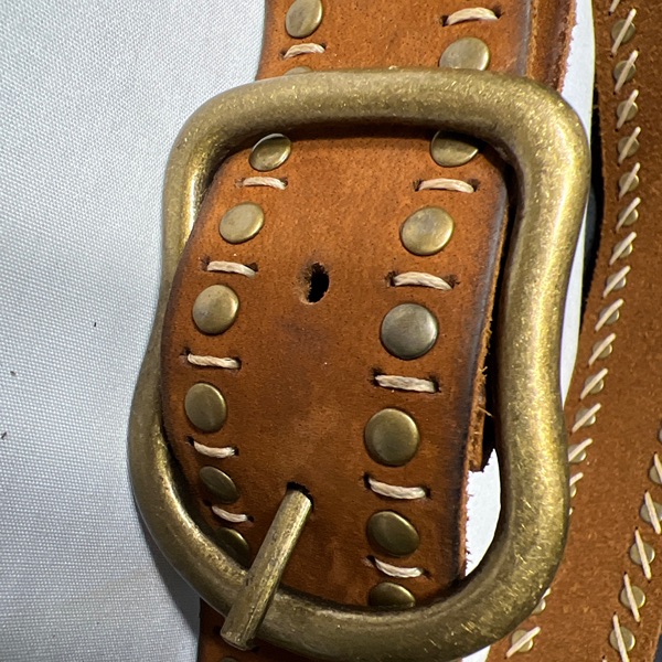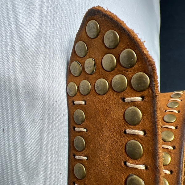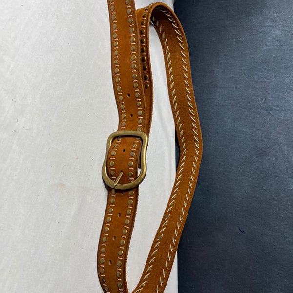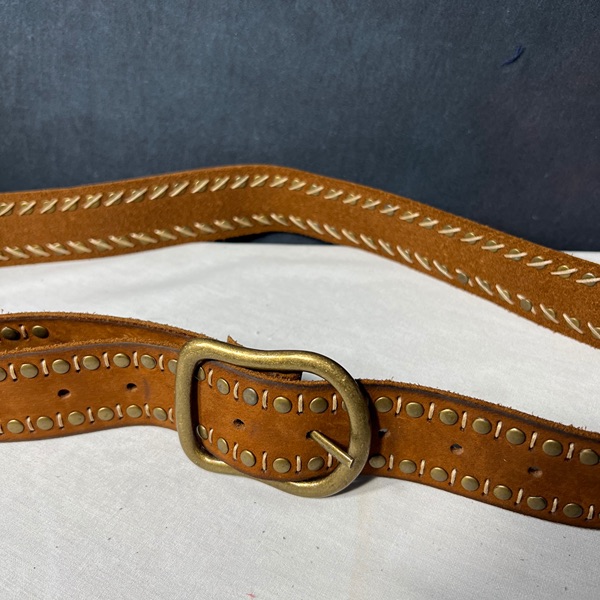 We The Free” Carmel Brown Suede brass Studded size M/L Brass Buckle Cowboy Western Belt. 47” with a 2 3/4” buckle. Excellent condition.