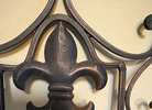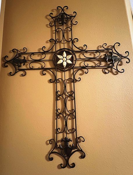 Beautiful metal crucifix with an inlaid center with ornamental stones in bronze finish. A beautiful fleur-de-Lize is displayed at the top. The overall finish is Baroque. The dimensions are: Height 35" Width 28". It is in magnificent, like-new condition.