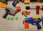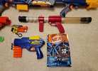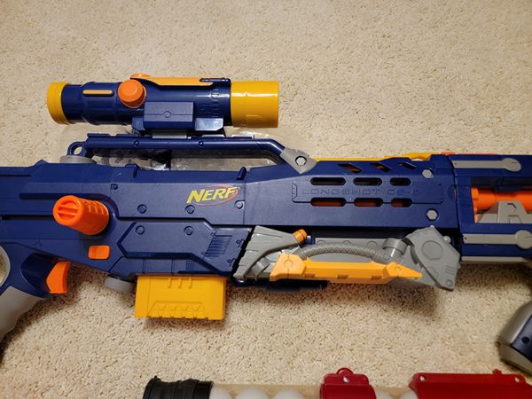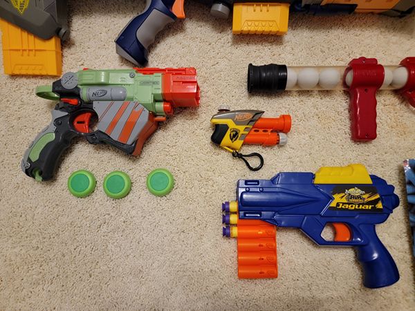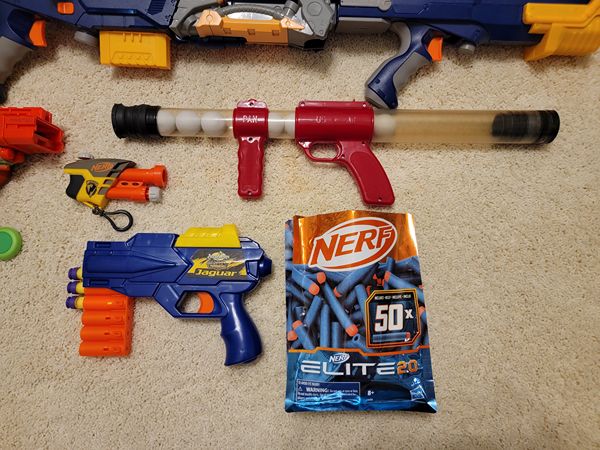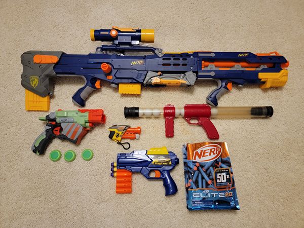 Includes Nerf Longshot CS-6, Vortex Proton, S.S. AS-1, Buzz Bee Jaguar, an unbranded foam ball launcher, and 50 darts.