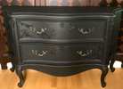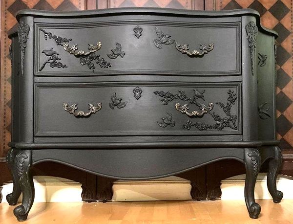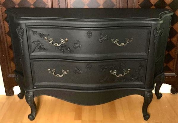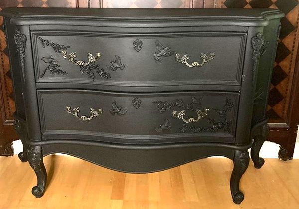 - Re-imagined, entry/buffet/coffee bar is ready for your home.- We cleaned, filled, sanded, primed, added flat velvety black paint in layers, hand poured and applied moulds of birds and branches and florals, then sealed in a flat poly for durability.- I created a luxurious velvety texture with a painting technique. It's hard to see it in pictures but it is a very luxurious feel and look in person.- The drawers are sturdy and glide smoothly in and out on their side rails with original hardware.- Solid and sturdy construction features sweeping lines and beautiful embellishments.- Color is a rich velvety black.