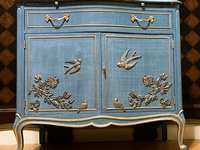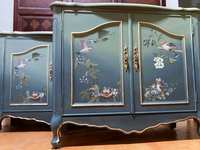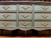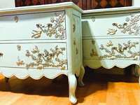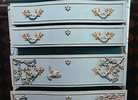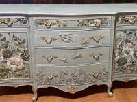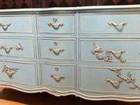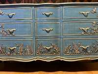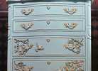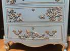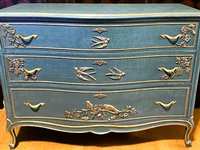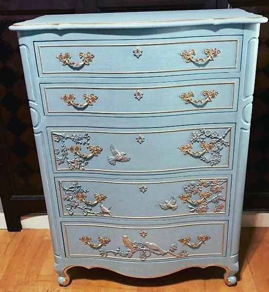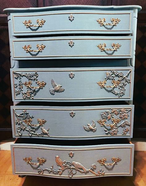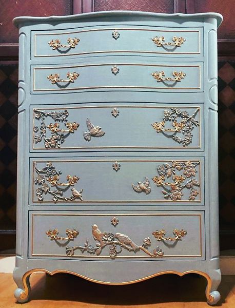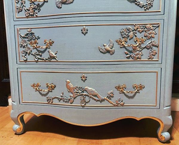 - We cleaned, filled, sanded, primed, added worn linen texture, applied hand poured moulds of birds, then painted in layers, gilded and sealed for durability.
