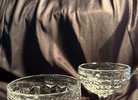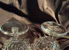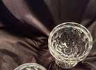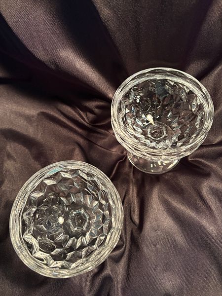 This set of 2 Vintage Fostoria American Champagne/Low Sherbet Footed Glasses is made of clear glass in a geometric pattern, these footed glasses showcase a classic American design from the Mid-Century Modern era. With a vintage production style and pressed glass technique, these glasses are a unique and stylish choice for all occasions. These glasses stand at 3-1/2" tall with a 3-1/2" wide top and hold 4 ounces. Discontinued.