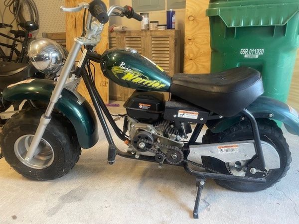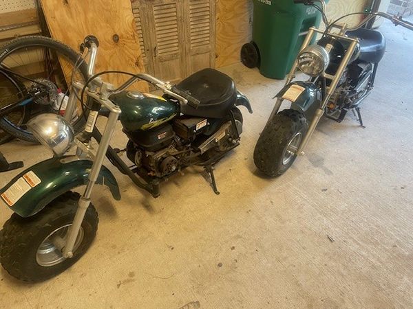2 Baja Warrior Mini Bikes by Baja Motorsports (www.bajamotorsports.com). Great fixer-uppers for aspiring young mechanics. Neither bike is currently operational, but it should not take much to get them going. Owners manual and parts manual are available online. Easy to operate--no clutch, no transmission. Make great backyard, neighborhood, or second-property run-arounds.