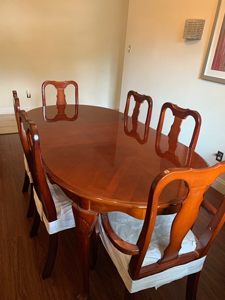 Cherry dining room set. Chairs have a few dings in them & have chair covers on seats due to age. Table has very minor scratches & is in good shape. We are moving & don’t have the space. $100 cash only. Grogan’s Mill area.