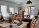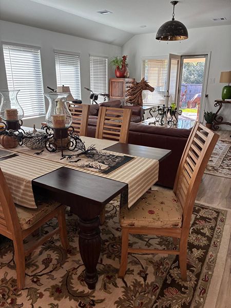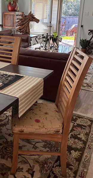 8 Sturdy Wood Dinning Chairs with custom-made cushions.