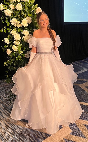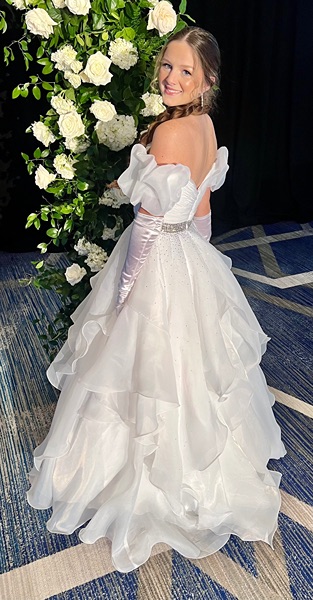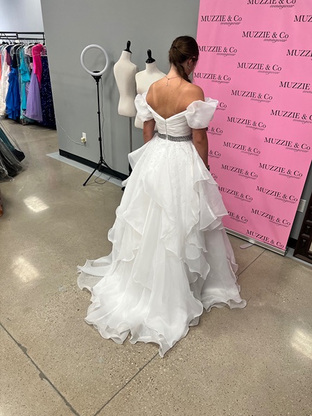 Dress worn One time for Senior Cotillion. Back is bustled in first photos. Photo with pink is not bustled. Can be worn either way. Spent approx $200 to be worneither way.Purchased on sale at Muzzies for $617.03. Size 6.