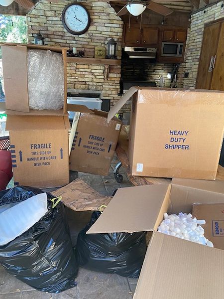 5 heavy duty large moving/shipping boxes.  1 filled with shipping "popcorn," 1 filled with large bubble wrap, 1 filled with styrafoam wrap and 1 filled with paper wrap and cushioned wraps.  Perfect for moving fragile items or shipping items.   I have photo if interested.