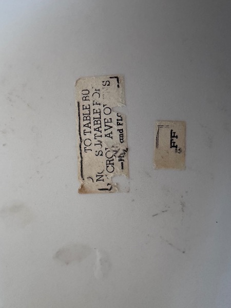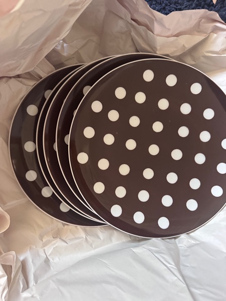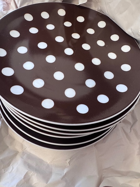 These dinner plates are from the discontinued Fitz & Floyd “Polka Dots” pattern, specifically the white dots on brown variant. Introduced in 1975, this hand-painted earthenware collection is highly collectible and known for its playful, mix-and-match design across multiple colors (like yellow, green, and blue backgrounds). Your set appears to be a stack of approximately 10.5-inch dinner plates, wrapped in original or archival packaging with a partial label reading “TO SUIT CROCKERY AND FL” (likely “To Suit Crockery and Flatware” or similar shipping notation). The “FF” marking on the label is a common abbreviation for the Fitz & Floyd brand, which has been producing fine dinnerware since the 1960s.