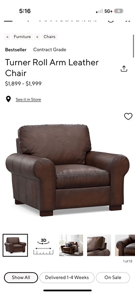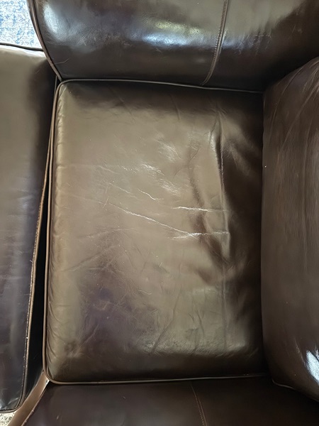 Beautiful Brown Real leather Chair from PB. Minor wear, small cuffs on the back side (see pic). Overall it’s in great condition.
