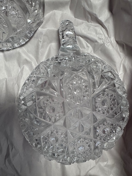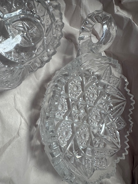 These are a set of vintage pressed glass serving pieces from the Imperial Glass Company (Bellaire, Ohio), produced circa 1911–1930s as part of their popular “NuCut” line (often marked simply “NuCut”). NuCut was designed to show molded patterns with starbursts, fans, arches, and hobnail motifs for a faceted, sparkling effect. The pieces are high-quality clear glass with scalloped/sawtooth edges and geometric designs.