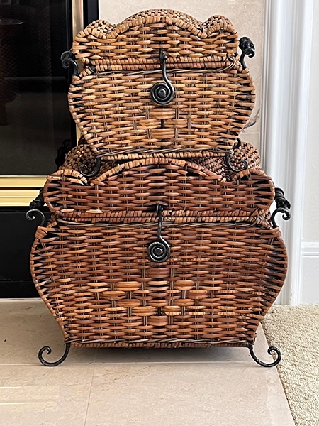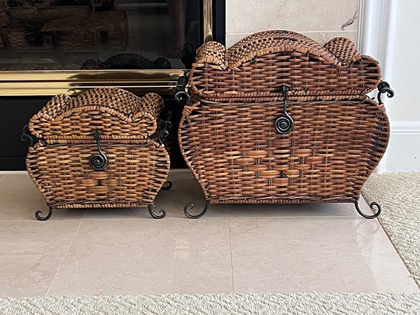 Two wicker baskets with decorative metal accents, perfect for storage or decor.
