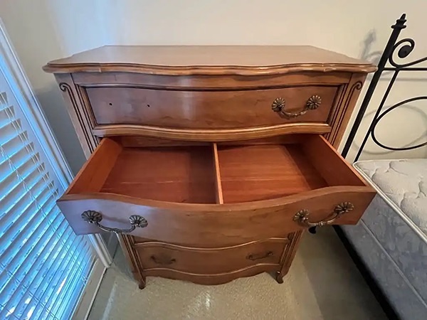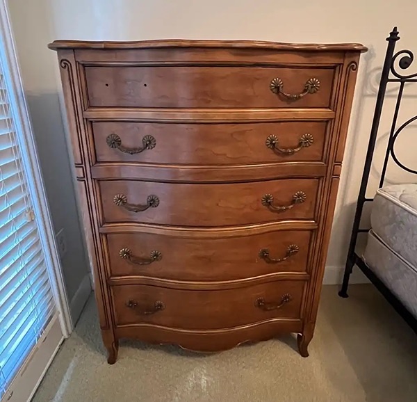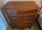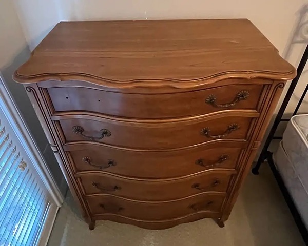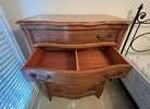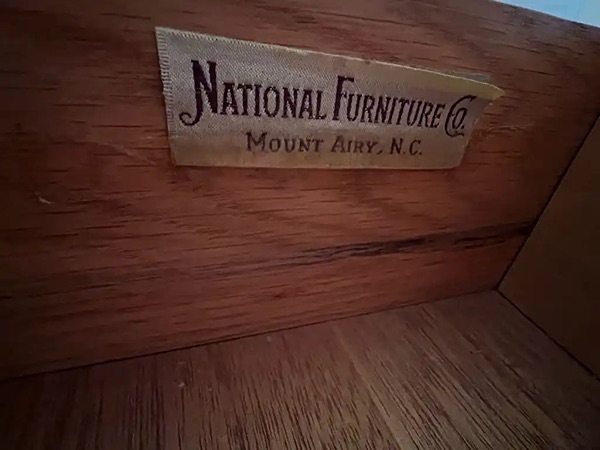 Elegant solid wood dresser by National Furniture Company, Mount Airy, North Carolina, with five drawers and ornate handles (one missing) and nightstand with drawer. Both are from the 1950’s! Approx.