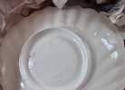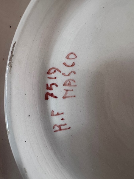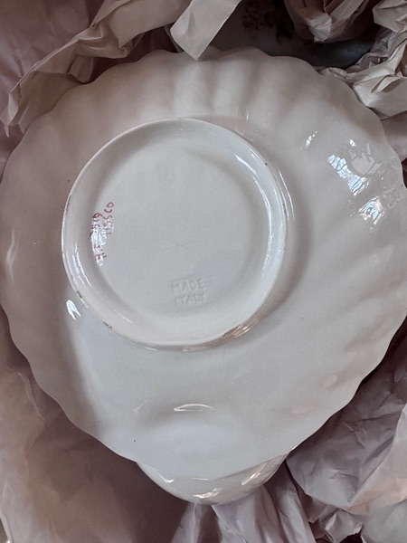 Vintage Italian ceramics from Este Ceramiche Porcellane, a prominent Italian factory in the Veneto region (near Padua) that produced high-quality hand-decorated porcelain and majolica pieces from the early 1900s through the mid-20th century. They were especially known for export items like your conchiglia (scallop shell) serving dish, often in glossy white with ruffled edges for nautical-themed appetizers—perfect as a chip-and-dip or relish holder. The “7519” is a standard model/size code (75 likely for the large shell dimension, 19 for the pattern variant), and the “Made in Italy” stamp confirms post-1891 export compliance. These were mass-produced but with artisanal finishing, so the K.F. adds a touch of provenance as the painter’s signature.