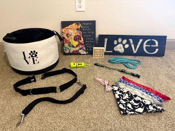 Adorable pet accessories includes:  soft-sided toy basket (10" T x 14" diameter), square wall art (12x12"), rectangular wall art (7x23'), 5' leash and martingale collar, 4 seasonal bandanas and a bow-tie, flashlight-bag carrier, adjustable waist-leash.  All in great condition!