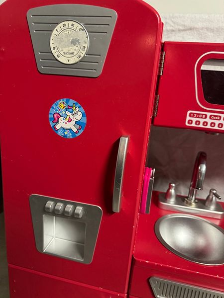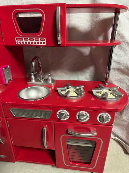 34" H x 32.5" W x 12" D *** Oven, cabinet, freezer, refrigerator and microwave doors open and close ** Working knobs on oven and sink ** Convenient storage above and below the sink ** Made of wood for long-lasting play ** See-through doors on oven and microwave ** Removable sink for easy cleanup
