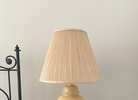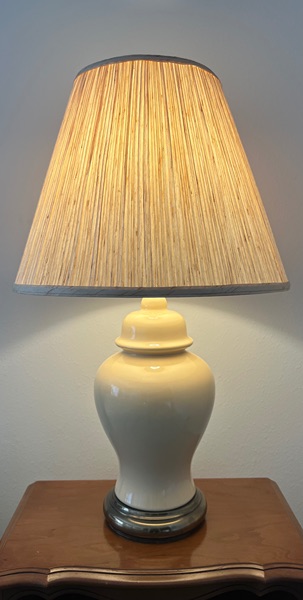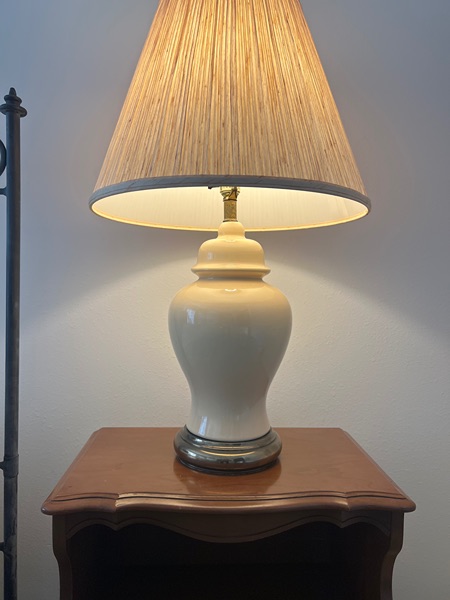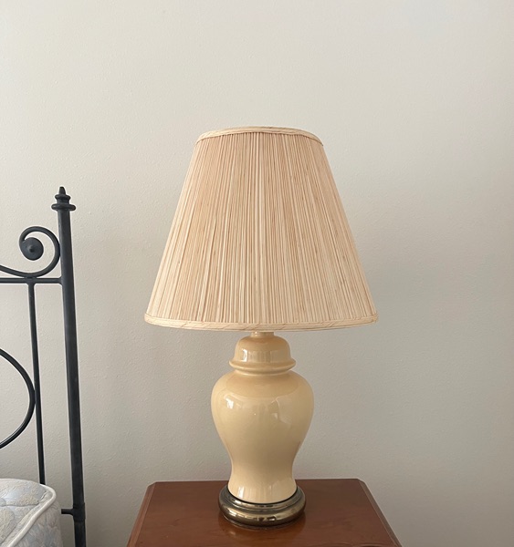 Vintage ceramic table lamp with a brass base and textured shade. Approx. 31” tall x 18” at widest part of shade…$40 firm