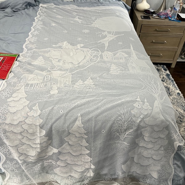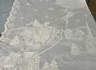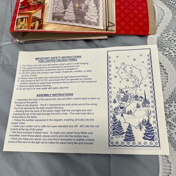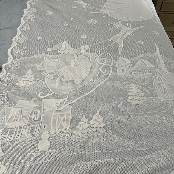 Vintage 2005 Merry Brite Holiday Lighted Panel 40 X 84”. In a opened bag but unused condition. The large panel is lovely with Santa Claus rising from the rooftops in his sleigh with reindeer. You can see the snow covered ground and the panel is lined in large snowflakes. Everywhere you see the little oval holes is where you are supposed to put the colored Light through. Lights work panel is in new condition comes with picture and instructions. Insert into your own curtain or tension rod