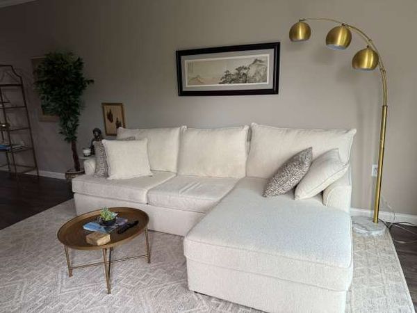 Barely used- purchased to furnish an apartment in The Woodlands for occasional visits. Great for small spaces, but with plenty of comfortable lounging room - 107-inch , ivory 2-piece sectional with right-arm chaise.