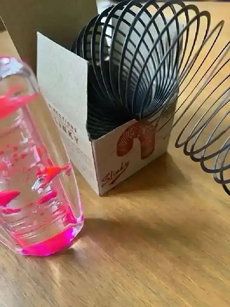 I forget the names of everything but the slinky (which is in good shape, except for the top). The oil and water toy is neat to watch/flip. The other gyroscope toy also glows in the dark!