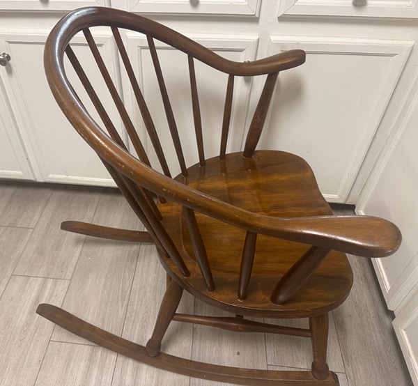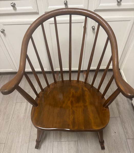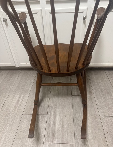 This is a Windsor-style rocking chair (also known as a Windsor rocker). Windsor chairs originated in England in the late 17th century and became popular in America during the 18th and 19th centuries. Key identifying features visible in your photos include:
