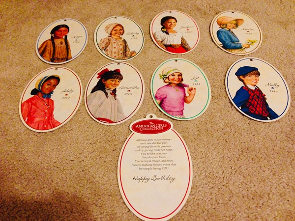 Features 8 of the original American girls on stiff paper panels with their faces on one side and a short biography of them on the other. Panels are tied together by ribbon. Very good condition. Asking $2.00.