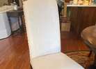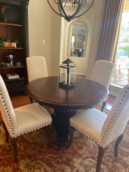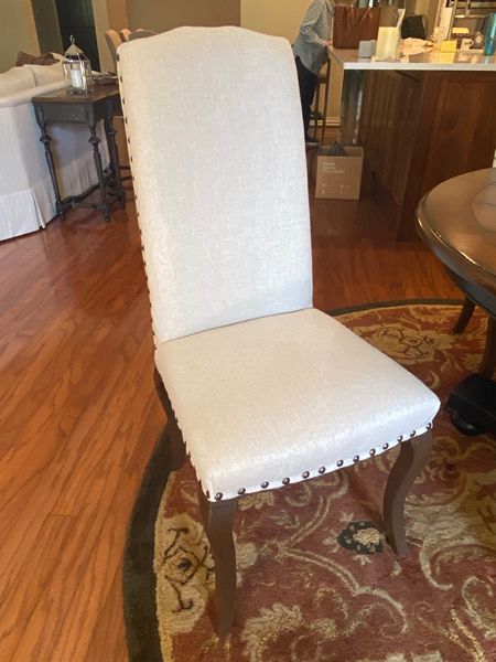 These classic French-style dining chairs are made of kiln-dried solid ash and a hardwood frame to prevent warping, splitting, cracking and mildew. Solid wood legs are hand-finished in a walnut stain. Deeply cushioned with foam fill, upholstered in an oatmeal linen blend upholstery, and trimmed with antique nail-head accents that trim the chair back and seat. $800 if purchased separately.