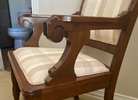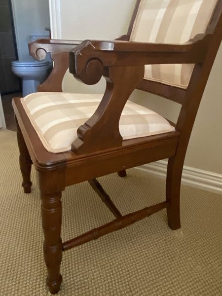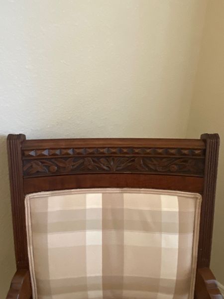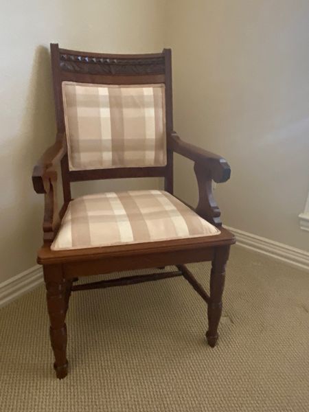 Antique chair with plaid moire beige upholstery; chair is very sturdy