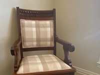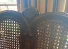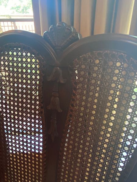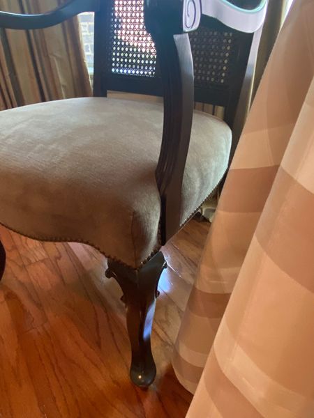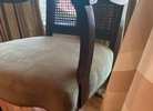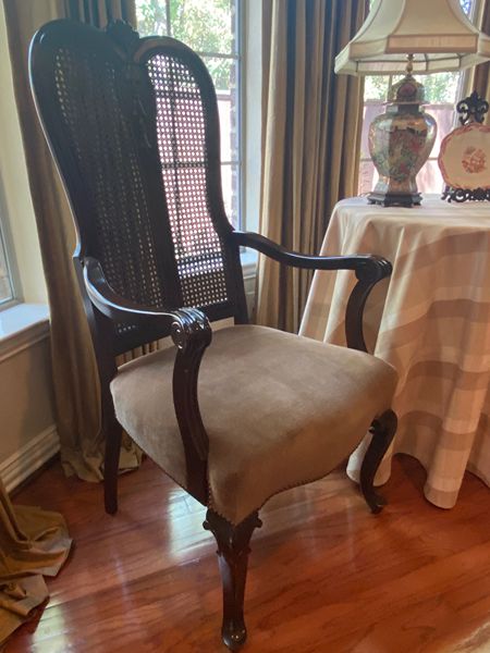Antique cane-back chair with neutral velvet upholstery; beautiful intricate wood carving; very sturdy