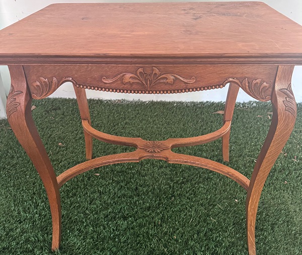 This is a Victorian-era oak side table (also called a lamp table or occasional table), likely dating from the late 19th to early 20th century (circa 1880–1910). It features distinctive Rococo Revival / French Provincial styling, evident in: