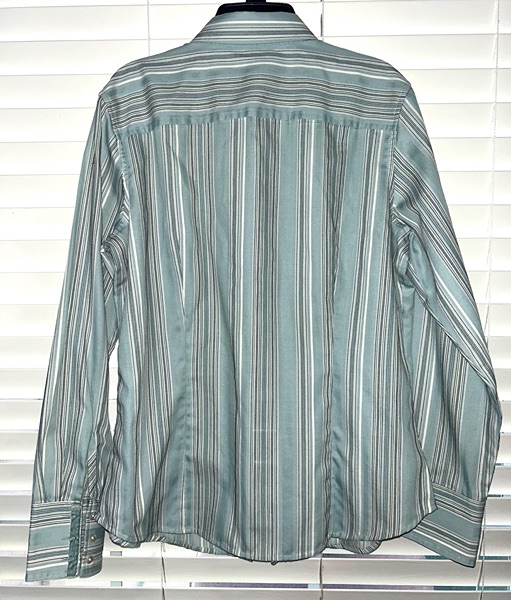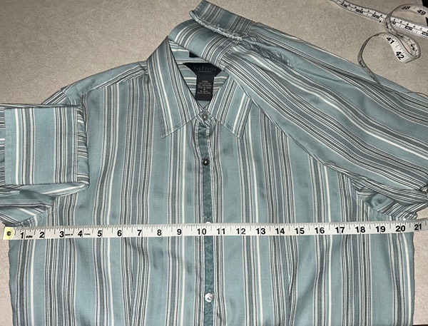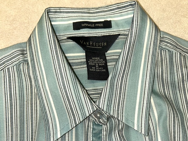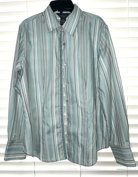Women's vertical striped, long sleeve, wrinkle free button up. 60% cotton / 40% polyester. Size medium. No holes, tears, or stains but minor wear/pilling. Smoke free home. $4