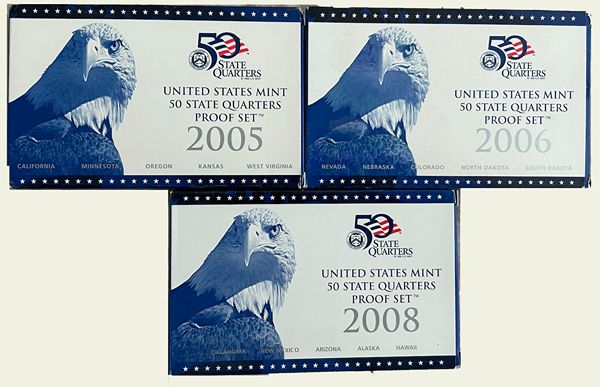 US Mint 50 States Quarters Proof Set, Years 2005, 2006, 2008. California, Minnesota, Oregon, Kansas, West Virginia, Nevada, Nebraska, Colorado, North Dakota, South Dakota, Oklahoma, New Mexico, Arizona, Alaska, and Hawaii. $25. Conroe (FM1488 & Old Conroe Rd) Text